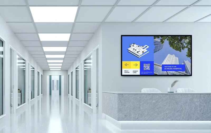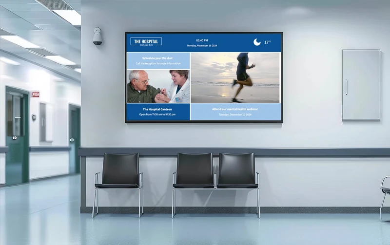 Digital signage screens in public areas can provide entertainment, information and advertisements for patients and visitors. Show hospital info, news, live TV, cafeteria menus, nearby services, parking etc. and customize the content for each unit, ward or hospital.