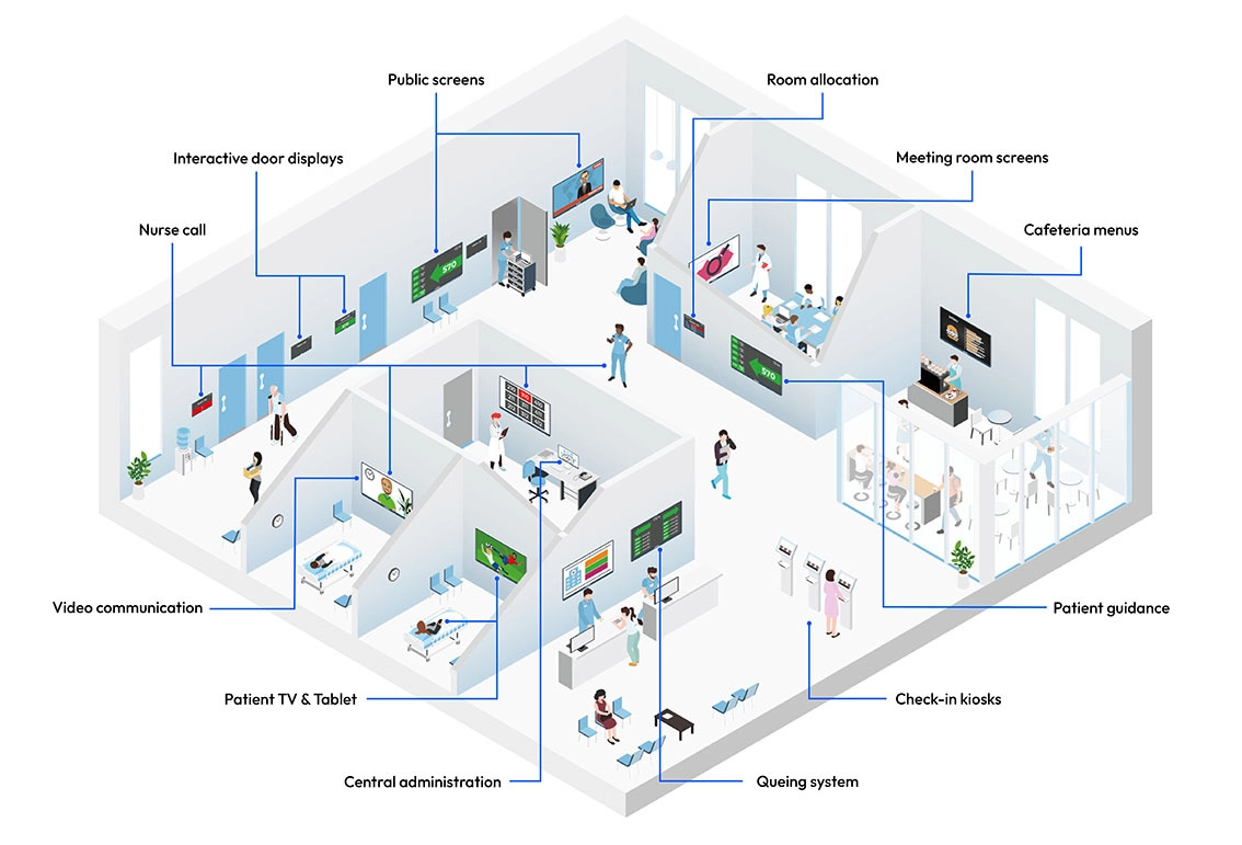 When the patients enter the building, our 24/7signage screens guide them to the right location. Our wayfinding solution can show floor plans, room numbers and queues. It even integrates with self-service kiosks for patient check-in.